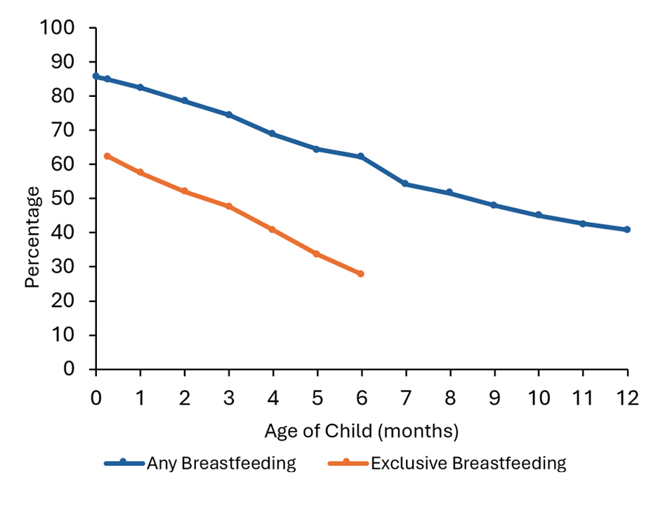Rates of any and exclusive breastfeeding by age among children born in 2022, NIS-Child, United States1,2,3
