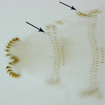 A 25-year-old male went to a local hospital complaining of a two-week history of worsening irritation of his left eye. He resides in a semi-rural area, where sheep and horses are raised, and recently returned from Samoa four weeks previous to his hospital visit. While at the hospital, he mentioned that he saw an object crawling on his conjunctiva and removed it. He could not remember any specific event that initiated these symptoms. Upon examination by slit lamp, three larvae were seen and it was noted that they moved away from the light. The larvae (Figures A-C), measuring approximately .75mm in length, were removed and sent to the laboratory for identification. What is your diagnosis? Based on what criteria?