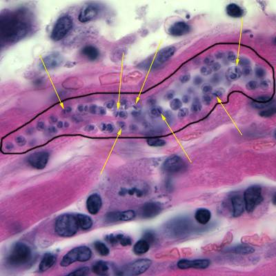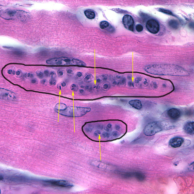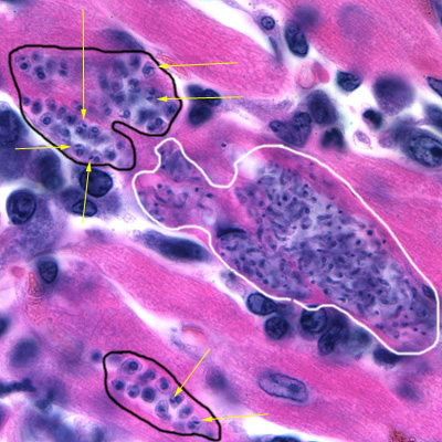 A CDC microbiologist was looking through slide boxes that had been archived to determine whether the slide quality was good enough to continue storing them. He came across a pathology slide of heart tissue that was dated “1929.” Figures A-C show what was observed on the H & E stained preparation. What objects do you see in the images?