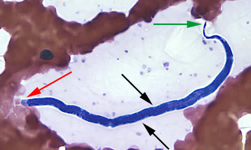 A hospital submitted blood films to CDC’s reference laboratory for identification of the microfilariae that were seen on the films. The object in Figure A was seen on a Wright-Giemsa stained blood film and measured approximately 180 µm. The object in B was seen on a Giemsa stained blood film and measured approximately 240-250 µm. Both A and B were taken at 500× magnification. What is your diagnosis? Based on what criteria?