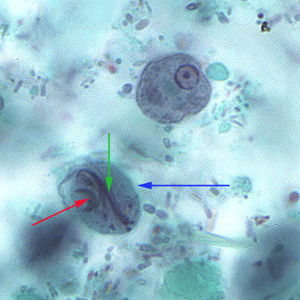 Images captured from a trichrome stained smear were submitted to DPDx for diagnostic assistance. The smears were made from a polyvinyl-alcohol (PVA) preserved fecal specimen, but no other patient or specimen information was given. The submitter wanted confirmation for one parasite they had identified and was not sure of the other organism observed on the smear. Figures A-C show the objects in question under 1000× magnification. All images were cropped to the same dimensions by DPDx. What is your diagnosis? Based on what criteria? What valuable information would have been useful if provided?