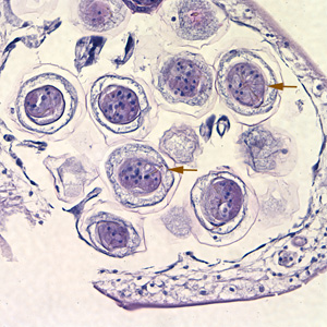 A 38-year-old man sought medical attention because of rectal bleeding. His only reported travel was to Laos two years ago. A colonoscopy was performed and based upon what was found during the procedure, he was given a presumptive diagnosis of tapeworm. The largest object recovered during the colonoscopy measured approximately 0.7 cm in length and 0.05 cm in diameter. Figures A and B, taken at 100× and 400× magnification respectively, were two of the images submitted to DPDx for diagnostic assistance. The DPDx Team concurred with the presumptive diagnosis but required actual specimens for examination to make a more specific identification. Figures C-E, taken at 100×, 400×, and 1000× (oil) magnification respectively, show what was observed on the hematoxylin and eosin (H & E) stained slide sent to CDC. The round to oval structures measured 35 to 40 micrometers in diameter. What is your diagnosis? Based on what criteria?