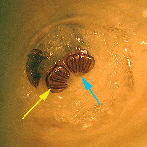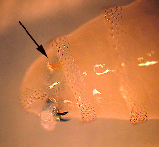 A 25-year-old man, who recently returned from a trip to Brazil, presented to his health care provider with a festering lesion on his forehead. The patient also complained of feeling things moving under his skin. Surgical removal of the outer surface of the lesion revealed several maggot-like organisms (Figure A) beneath the skin. Specimens were sent to the CDC for diagnostic assistance. Figure B shows a close-up of the anterior end of one of the organisms; Figure C shows a close-up of the posterior end. Figures D and E show structures dissected out of the anterior end of one of the organisms. What is your diagnosis? Based on what criteria?