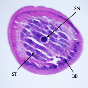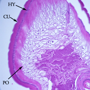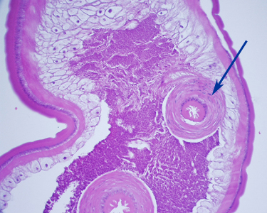A 36-year-old immigrant from Mozambique presented to his health care provider with heartburn and chronic right abdominal pain. All previous ova and parasite (O&P) examinations were negative. An endoscopy was performed, upon which a worm-like object was observed in the ascending colon near the ileocecum. The suspicious object, measuring approximately 7 mm in length, was removed, collected in 10% formalin, and sent to Pathology for work-up. The object was sectioned, stained with hematoxylin and eosin (H&E) and reviewed by the attending pathologist, who in turn captured the following images and sent them to DPDx for telediagnosis assistance. What is your diagnosis? Based on what criteria?