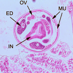 A four-year-old child was admitted to the hospital for sever abdominal pain mimicking appendicitis. A small section of bowel was removed and sent to the Pathology Department for work-up. A section of tissue was preserved in formalin, sectioned, and stained with hematoxylin and eosin (H&E). Images A–C show what was observed at 100x magnification of slides made from the tissue specimen. In addition to the biopsy, stool was collected for routine ova and parasite (O&P) examination. The object is Figure D, which measured on average 73 micrometers long by 37 micrometers wide, was seen in low numbers in a concentrated wet mount from a formalin-preserved aliquot of the stool. What is your diagnosis? Based on what criteria?