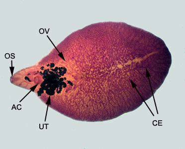 A 35-year-old man from Nepal presented at a hospital with recurring cholangitis; the patient had been experiencing symptoms for the previous six months. An MRI revealed two lesions in the liver, measuring approximately 5 centimeters long by 2 centimeters wide. Both lesions had cystic as well as solid components. An endoscopic retrograde cholangiopancreatography (ERCP) was also performed in the common bile duct, revealing flat leaf-shaped objects (Figures A–B). The objects were removed and collected in 10% formalin; they measured on average two centimeters in length (Figure C). One of the specimens was sent to a reference laboratory for identification, where it was stained with carmine (Figure D). What is your diagnosis? Based on what criteria?