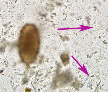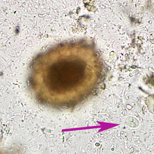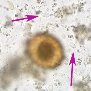 A 10-year-old immigrant from Haiti was screened for parasites at a refugee screening clinic. Stool specimens were collected in 10% formalin and polyvinyl alcohol and sent to the local state health laboratory for testing. Figures A, C, and E show what was observed at 400x magnification in a wet mount prepared from the formalin-preserved stool. Figures B, D, and F show the same fields, respectively, but in different focal planes. The objects in Figures A and C measured on average 65 micrometers long by 40 micrometers wide. The object in Figure E measured 90 micrometers long by 45 micrometers wide. What is your diagnosis? Based on what criteria?
