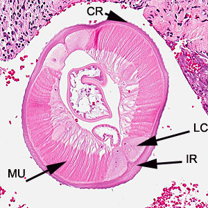 A 55-year-old woman sought medical attention for a nodule on the right side of her head. The patient presented with pain on the right side of her head for the past two months. Two weeks prior to seeking medical attention, she felt a painful 0.5 cm lump on her right temple. The nodule was removed surgically and sent to Pathology for histological testing. Stool and blood specimens were also collected, processed, and examined for parasites with negative results. The nodule was sectioned, stained with hematoxylin and eosin (H&E), and examined microscopically. Images were captured and sent to DPDx for diagnostic assistance. Figure A was captured at 40x; Figure B at 100x; Figures C and D at 200x magnification. What is your diagnosis? Based on what criteria?