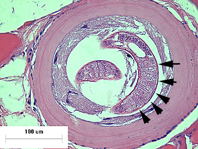 A hunter prepared dried jerky from fresh bear meat and provided some to a group of friends. Most developed moderate to severe abdominal pain, nausea, and fatigue within 48 hours. Some of the bear meat was submitted for laboratory testing. Images of stained histological sections of bear meat were sent to the DPDx Team for confirmation of parasites. Figures A and C were taken at 200x magnification; Figures B, D, and E were taken at 400x magnification. What is your diagnosis? Based on what criteria?
