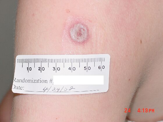 Vaccine “take” on day 6 after vaccination in a first-time vaccinee.